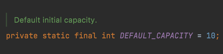 기본적으로 new ArrayList<>()를 하게 되면 위와 같은 생성자가 호출되는데, 이때 기본적으로 ArrayList의 크기(capacity)는 10으로 지정되어 있다.