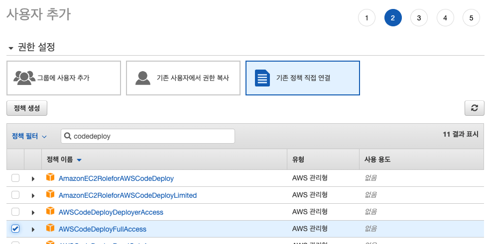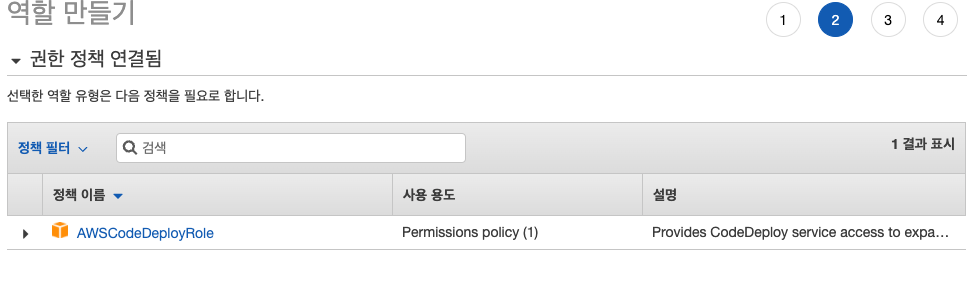 - 다음과 같이 두 개의 권한 추가 (S3접근 권한, CodeDeploy 접근 권한)