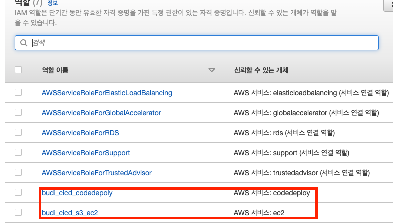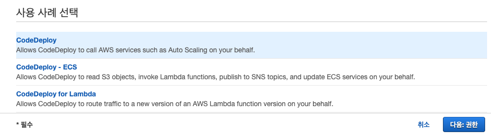 - 결과적으로 총 2개의 역할을 만들고 각각 EC2 및 Code Deploy에 부여해야 함.
