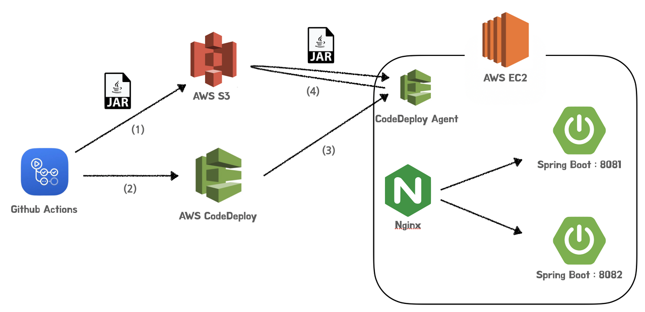 - EC2에 설치된 AWS CodeDeploy Agent가 S3로 부터 압축파일을 가져오고 appspec.yml 스크립트를 실행