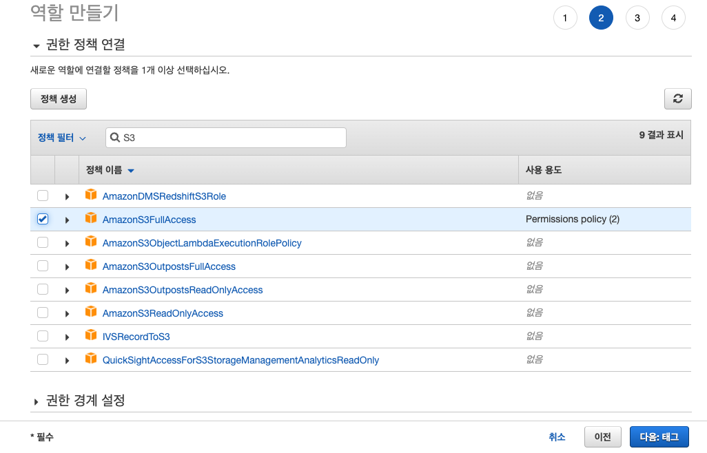 1) EC2에 설정할 역할 만들기 : EC2에서는 S3에 접근할 수 있어야 하기 때문에 S3FullAccess 역할을 만든다