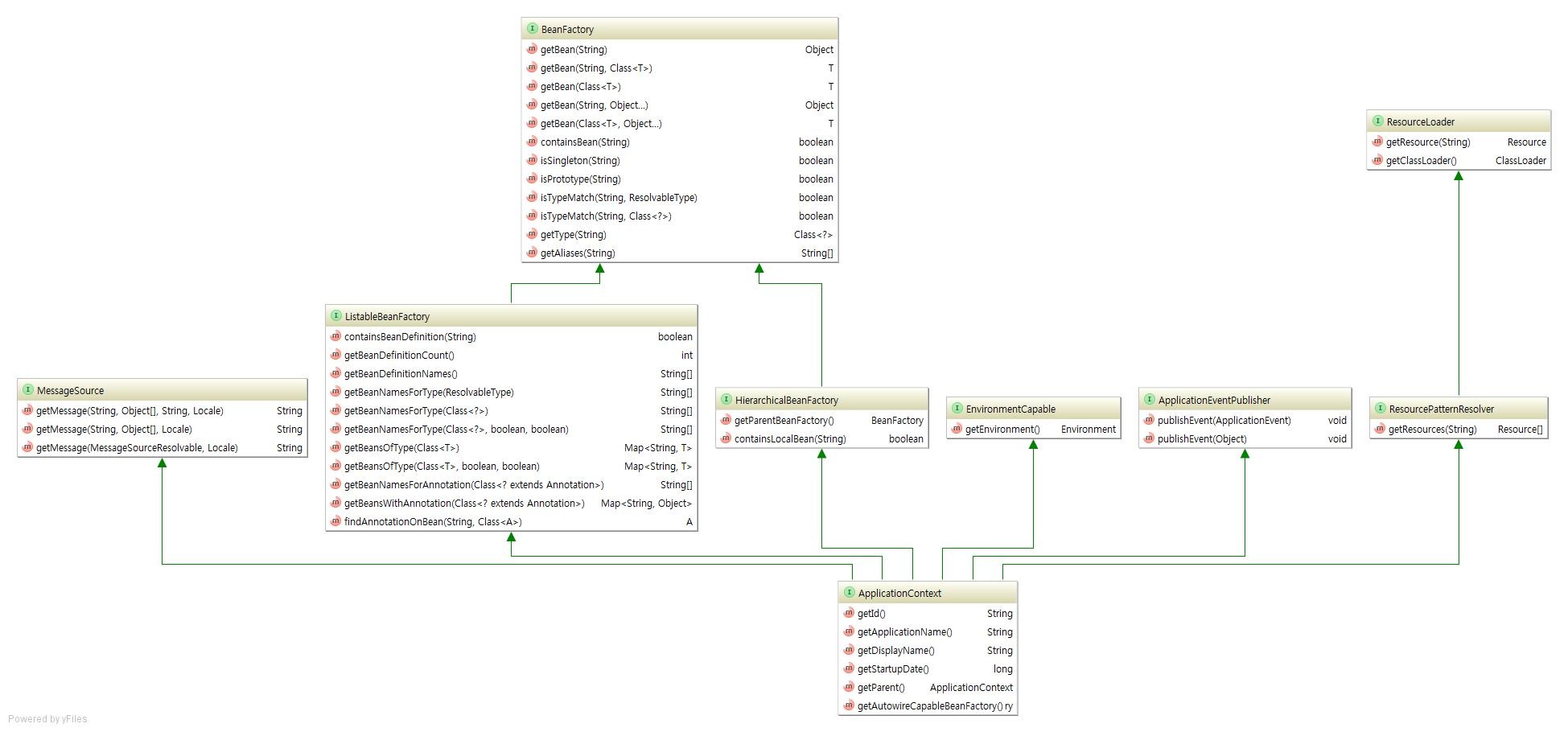 - ApplicationContext는 'BeanFactory'를 상속한다. BeanFactory의 getBean 메소드를 보면 알 수 있듯이, 객체에 대한 생성과 조합, 의존관계를 설정하는 IoC의 기본 기능이 들어 있다.