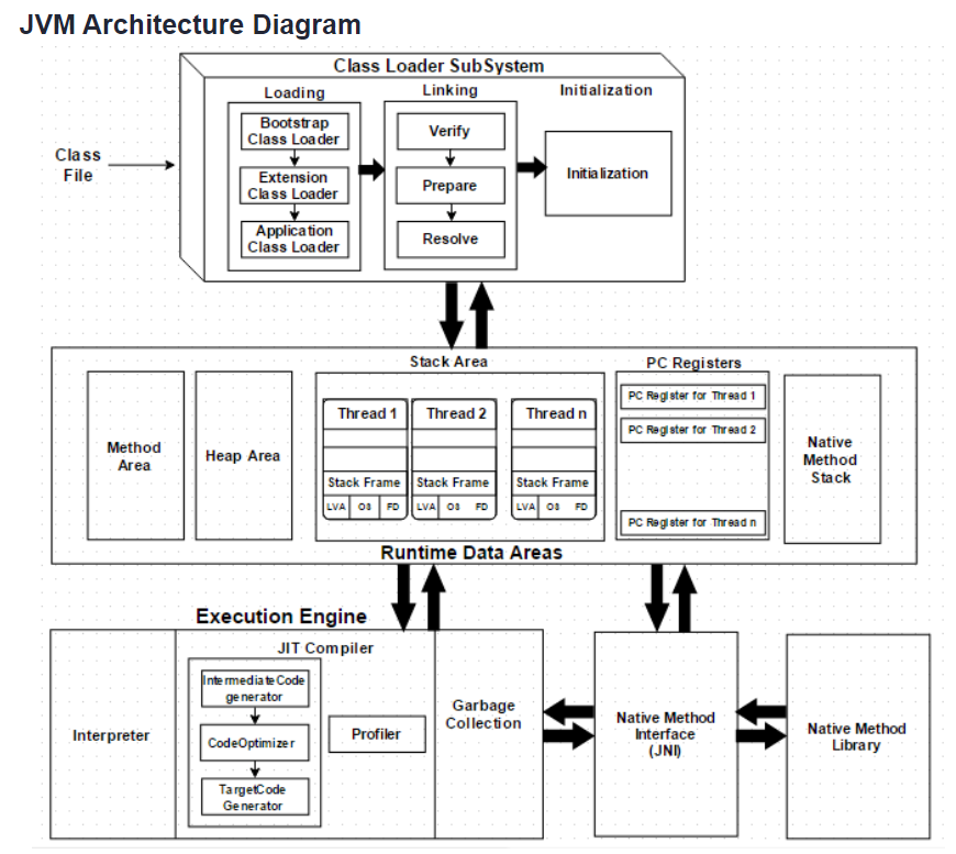 5) JVM의 Execution Engine은 JVM 메모리에 올라온 바이트코드들을 명령어 단위로 하나씩 가져와서 기계어로 변환시킨다. 변환된 기계어는 JVM의 메모리구조(Runtime Data Area)의 각 영역에 배치되며 GC(Execution Engine에 포함)와 함께 실행된다.