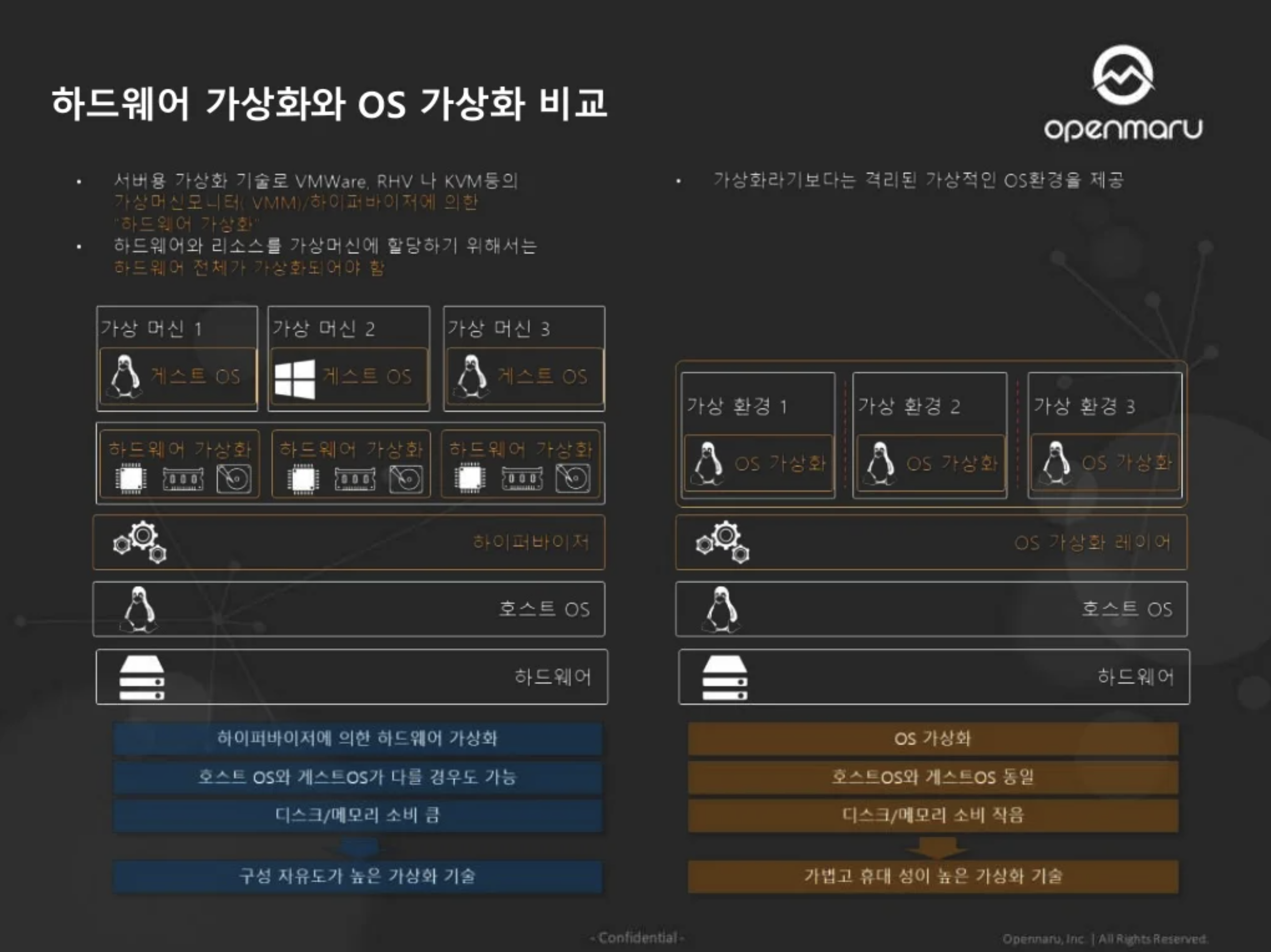 - 무거운 게스트OS가 구동되는 형태이다 보니 여러 개의 VM이 구동된다면 성능상 이슈가 발생하기 쉽다.