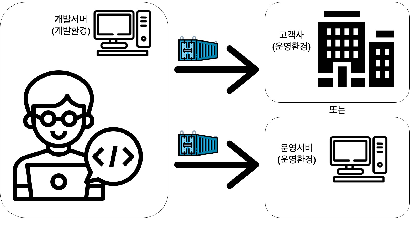 만약 위 그림에서 컨테이너 기반으로 프로그램을 만든 게 아니라면, 개발자는 개발을 하고 제품을 고객사에 판매할 때, 고객사의 운영환경 컴퓨터에 해당 프로그램이 실행될 수 있는 환경을 미리 동일하게 구축했어야 했다. 즉, 개발환경과 운영환경이 다를 수밖에 없었다.