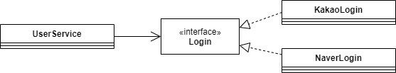 그림1에서는 UserService 객체가 각각의 로그인 객체에 직접 적으로 의존해 2개의 의존도를 갖는다고 가정한다면, 그림2에서는 추상형 Login 인터페이스를 중간에 위치시킴으로써 UserService 객체는 1개의 의존도로 줄어들었다. 객체 간 의존도를 낮게해야 추후 코드변경 가능성을 줄여 유지보수에 용이하게 한다.