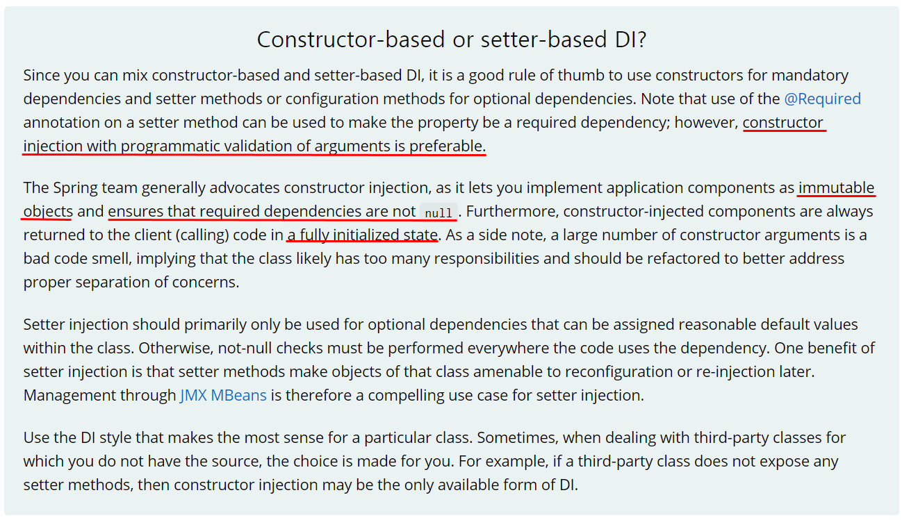 위 스프링 공식 문서를 보면 생성자 기반의 DI를 권장한다고 한다. 생성자 기반의 DI를 사용하면 객체를 사용할 때 해당 객체가 갖는 의존성이 모두 정해져 있다고 보장할 수 있다. 이를 통해 NPE과 같은 런타임 예외 발생 여지를 줄인다.