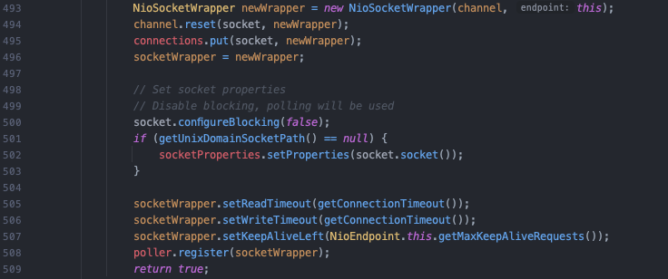 - Acceptor가 호출한 setSocketOptions 메소드에서는 Acceptor가 전달한 새로운 소켓인 SocketChannel 객체를 인자로 받고 톰캣의 NioChannel 객체로 감싼다. (line 493)