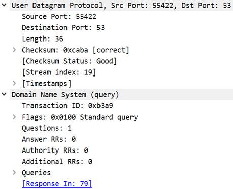 [사진2]는 no 78패킷의 상세정보를 보여준다. [사진2]에서는 애플리케이션 계층 프로토콜 DNS에서 생성된 질의 메시지가 트랜스포트 계층 프로토콜인 UDP에게 메시지가 넘어갔고, UDP는 받은 메시지에 헤더 필드를 추가한 후에 최종 세그먼트를 네트워크 계층에 넘겨주었음을 알 수 있다. 네트워크 계층은 UDP 세그먼트(transport 계층에서의 패킷)를 데이터그램(네트워크 계층에서의 패킷)으로 캡슐화하고 네임 서버에 데이터그램을 전송한다. 이때, 질의 호스트에서의 DNS 애플리케이션은 질의에 대한 response를 기다린다.