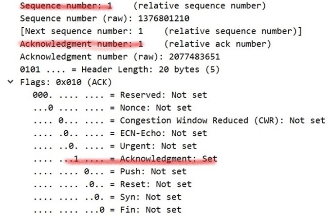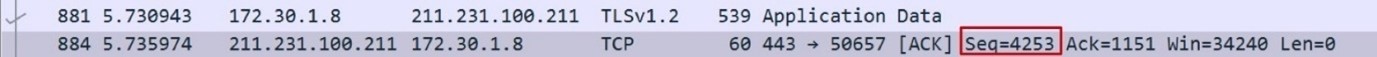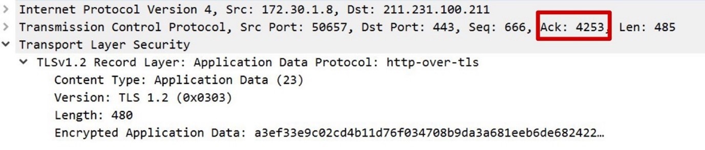 [사진8]은 no 1528 패킷의 정보이다. 서버로부터 SYN플래그가 set된 요청 패킷을 받았고 이에 대한 응답을 보내는 과정이다. 서버로부터 받은 sequence number에 1을 더한 Acknowledgement Number와 ACK 플래그를 set하여 서버에게 보낸다. 이 패킷을 서버가 받는다면, 이 패킷을 서버가 받는 시점이 서버가 TCP연결을 확신하는 시점이다. 이후 클라이언트는 애플리케이션 데이터가 포함된 세그먼트를 보낼 수 있고, 혹은 이 패킷(no 1528)에 포함시켜 보낼 수도 있다.