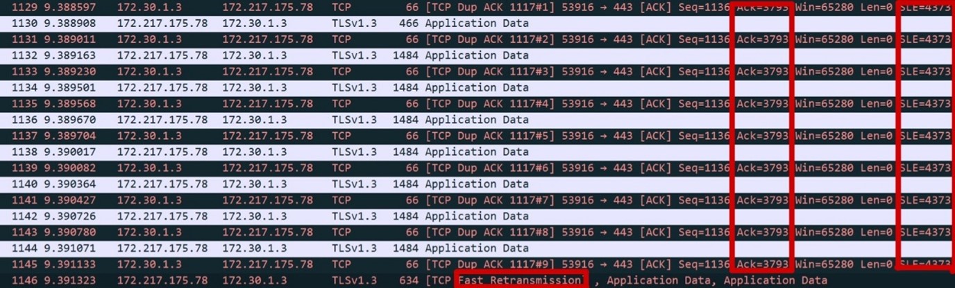 [사진16]은 유튜브를 보면서 패킷을 캡처한 일부이며 172.217.175.78은 구글서버이다. 클라이언트는 중복적으로 같은 ACK을 3개 이상 보내고, 이에 대한 응답으로 서버는 순서번호가 3793인 패킷을 재전송하는 과정을 보여준다. Fast Retransmission의 경우 빠르게 3개이상의 중복된 ACK을 받으면 timeout이 발생하지 않더라도(timeout 내에) 재전송을 하는 방식이다. TCP가 Fast Retransmission을 제공하는 이유는 timeout기간이 상대적으로 길기 때문이다. 만약 TCP가 Fast Retransmission을 제공하지 않는다면 패킷 loss가 발생하더라도 상대적으로 긴 timeout을 기다리고 나서야 비로소 대응을 할 수 있다. 만약 이 긴 시간을 기다리며 RTT를 측정하면 RTT 신뢰도는 떨어진다.