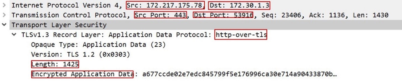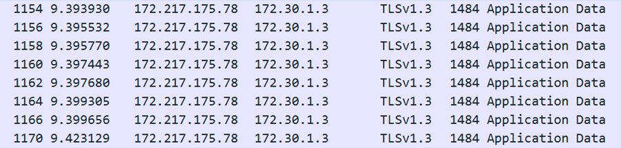 [사진23]은 유튜브를 시청했을 때의 패킷 캡처 일부분이며, 172.217.175.78은 구글이다. 구글서버에서 TLS v1.3 프로토콜을 이용하여 애플리케이션 데이터를 안전하게 보내고 있음을 알 수 있다. 또한 이 경우 애플리케이션 데이터는 암호화되었으므로 애플리케이션 데이터에 대한 정보는 확인할 수 없었다.