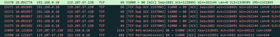 [사진17]은 청와대(119.207.67.230) 홈페이지에서 여러 컨텐츠를 보았을 때 결과이다. 클라이언트(192.168.0.10)가 중복된 ACK넘버를 갖는 패킷을 여러 개 보내면서, 서버에게 순서번호 1328491(상대 값) 패킷을 계속 요청하는 것을 보아, 아마도 서버는 클라이언트에게 순서번호 1328491패킷을 보냈지만 loss가 발생한 것으로 보인다. 이에 대해 [사진17]의 마지막 두 개의 패킷을 서버가 재전송하고 있음을 알 수 있다.