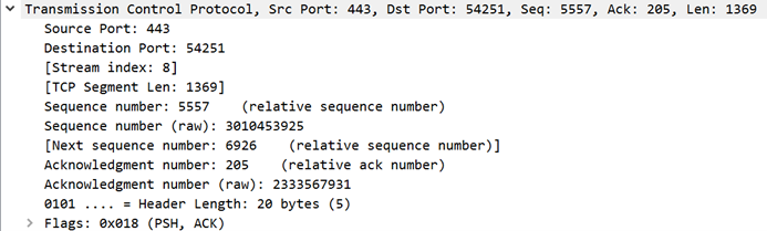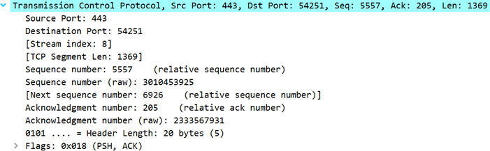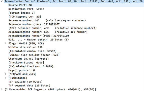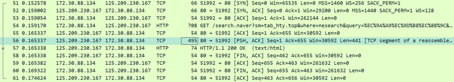 [사진12]는 네이버 서버에서 애플리케이션 계층부터 시작하여 생성된 패킷이다. 즉, no 54에서 애플리케이션이 요청한 데이터를 포함한다. 가장 마지막 라인을 보면 no 56과 57은 클라이언트로 오는 링크상의 MTU에 따른 fragmentation이 발생하였고 결국 no 56과 57은 원래 같은 패킷이었으며 클라이언트에 도착하여 reassemble되었음을 알 수 있다. No 54에서 654byte를 보냈고, 위 패킷의 ACK번호는 1+654인 655가 된다.
