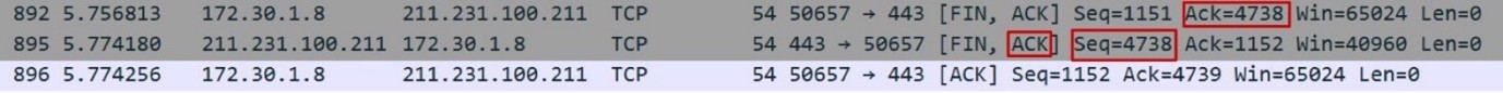 [사진27]은 위의 [사진25]와 [사진26]과 같은 패킷 캡처 파일이며 카카오톡PC버전에서 로그아웃 했을 때의 결과이다. 4-way handshaking과 비교하면, [사진27]은 첫 번째 FIN 플래그(먼저 연결 종료를 신청한 클라이언트 쪽에서 보낸)에 대한 응답인 ACK 플래그 패킷이 빠저있다. 하지만 카카오톡이 보낸 no 895패킷을 보면 ACK번호로 연결종료를 요청한 패킷을 받았으며 FIN 플래그를 set함으로써 연결종료를 서로 요청했음을 알 수 있다. 마지막으로 클라이언트는 no 896 패킷을 보냄으로써 카카오톡이 보낸 FIN플래크 패킷을 받았음을 확인한다. 따라서 3개의 패킷으로도 보다 빠르게 TCP 세션을 종료할 수 있음을 알 수 있었다.