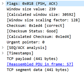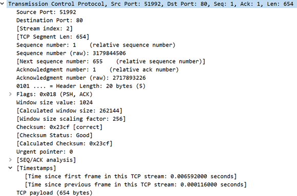 [사진11]은 no 54패킷(본격적으로 애플리케이션 데이터가 보내지는 시점)의 TCP header부분을 캡처했다. TCP연결이 성립한 후 클라이언트는 상대적인 순서번호 1과 ACK번호 1을 보내면서 시작하고 있다. TCP 헤더 길이는 20byte이며, 클라이언트는 자신의 window size가 1024 byte라고 알리고 있다. checksum도 보내고 있다. 이는 sender와 receiver에서 같은 알고리즘으로 계산되어 오류여부를 판단하는데 이용된다. urgent pointer는 필드가 유효한지 나타내며 긴급 데이터를 전송하기 위해 사용된다. PSH(push) 플래그가 SET되어 있는데, 이 패킷을 받은 receiver는 추가 데이터가 버퍼에 들어갈 때까지 기다리지 않고 즉시 데이터를 애플리케이션으로 내보낸다. 페이로드(애플리케이션 데이터)가 654byte 포함되어 있다. no 55 패킷은 no 54패킷을 잘 받았다는 TCP차원에서 보낸 패킷이다.