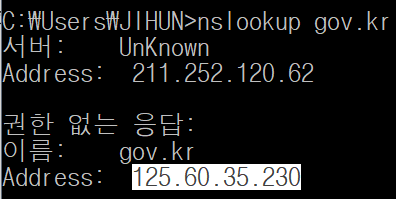 [사진4]는 정부24(gov.kr)에 http로 접속했을 때 처음으로 보여지는 TCP패킷 결과이며, [사진5]는 정부24의 웹서버의 IP주소를 검색한 결과이다.