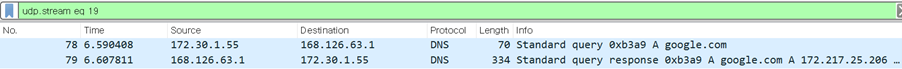 [사진1]은 google.com에 접속하였을 때 DNS 메시지를 보여준다. No 78 패킷은 호스트에서 DNS 어플리케이션이 query(질의)를 생성하고 DNS 질의 메시지를 작성했음을 보여준다. 또한 [사진1]에서 해당 DNS의 stream번호 19(udp.stream eq 19)로 검색했을 때 2개의 결과만 나왔다. 따라서 UDP 연결 수립을 위한 어떠한 interaction없이 바로 애플리케이션 데이터를 보내고 있다. 따라서 목적지 end에 존재하는 UDP개체와 호스트의 UDP는 어떠한 handshaking도 수행하지 않음을 알 수 있다.