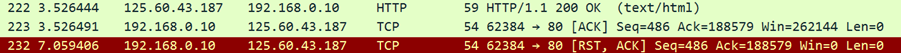[사진20]은 통계청 홈페이지에 접속하고 창을 닫았을 때의 결과이다. 125.60.43.187은 통계청의 웹서버 주소이다. 해당 패킷 캡쳐 파일에는 4-way handshaking을 통한 connection 종료 과정은 없었으며 클라이언트가 일방적으로 connection 종료를 했음을 알 수 있다. reset을 통해 이전 connection에 할당되었던 자원을 해제하고 시스템을 사용가능 하게 만들며 TIMED_WAIT만큼의 시간이 필요하지 않게 된다.
