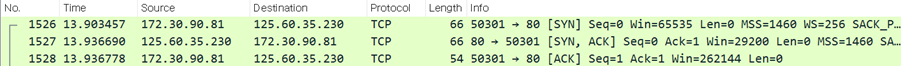 [사진10]은 위의 TCP connection을 종료하는 단계에서 설명한 것과 같은 패킷 캡처이다. 위에서 말했듯이, No 51 ~ no 53은 3-way handshaking을 이용한 TCP 세션 확립을, no 58 ~ no 61은 4-way handshaking을 이용한 TCP 세션 종료과정을 보여준다. No 54은 TCP connection이 성립한 후, 클라이언트의 어플리케이션에서 데이터를 본격적으로 보내고 있음을 보여준다.