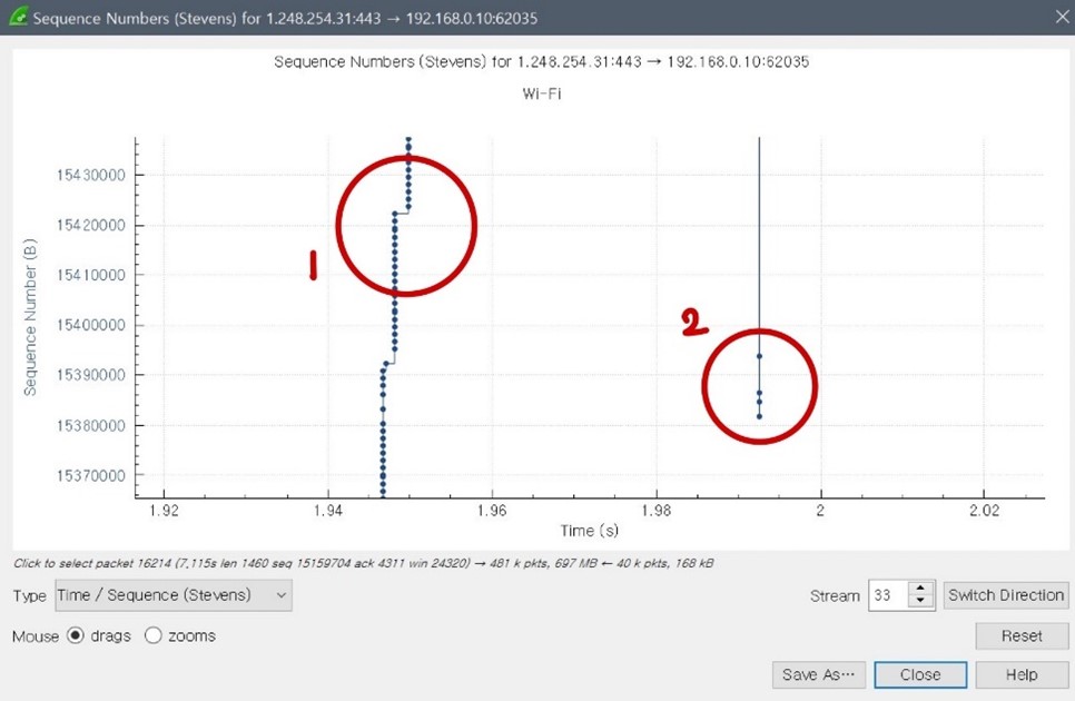 [사진19]의 1번 구간과 2번 구간을 비교해 보면, 1번 구간은 시간상으로 2번보다 이전에 클라이언트가 받은 패킷인데, 이는 2번 구간의 패킷보다 큰 순서번호를 갖고 있다. 따라서 2번 구간의 패킷들은 Retransmission된 패킷을 의미한다. 여기서 알 수 있는 또 다른 점은 TCP는 GBN방식이 아니라는 것이다. GBN방식이라면 재전송이 될 패킷과 그보다 큰 순서번호를 갖는 패킷들이 모두 재전송되어야 할 텐데, [사진19]에서 보여주는 그래프를 보면 TCP는 기껏해야 세그먼트 한 두개 만을 재전송하고 있다.