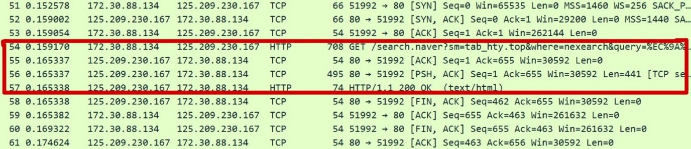 [사진21]의 no 56패킷에는 PSH 플래그가 set되어있으며, 클라이언트에서 no 57패킷과 reassemble되는데 no 57패킷은 no 54에서 클라이언트가 요청한 데이터를 포함한다. 또한 no 57이후로는 네이버 초기 창을 띄우는데 더 이상의 데이터 교환은 없다. 여기서 알 수 있는 점은 PSH 플래그가 설정된 패킷을 네이버 서버가 보냄으로써 클라이언트에 추가할 데이터가 더 이상 없고 응답 데이터가 애플리케이션으로 즉시 전송되어야 함(빠르게 네이버 창의 content를 띄움)을 알 수 있다. 즉, no 56패킷은 애플리케이션 데이터를 포함하는 no 57패킷과 reassemble되므로 이전에 서버가 보냈던 애플리케이션 데이터부터 no 57이 포함하는 애플리케이션 데이터까지(사실 이전에 보낸 데이터는 없음) 클라이언트의 버퍼에서 빠르게 애플리케이션으로 넘기라는 의미이다, 이는 네이버 접속 창을 구성하기위한 content를 모두 보냈음을 의미한다.