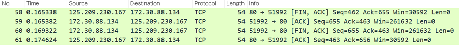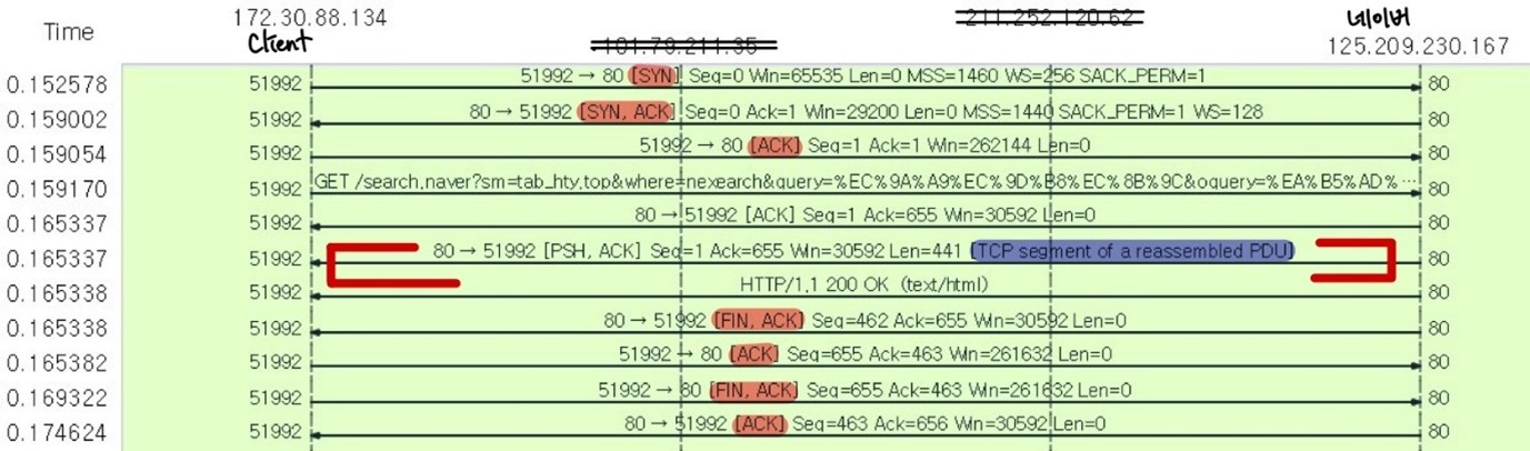 125.209.230.167는 네이버의 서버의 IP주소이며 네이버 서버와 클라이언트가 4-way handshaking 방식을 이용하여 TCP connection을 종료하는 과정을 보여준다. No 58 패킷은 네이버 서버가 먼저 TCP연결을 종료하고자 TCP header의 FIN과 ACK플래그를 SET하여 전송하며, 이는 TCP연결 종료를 요청한 것이다. No 59 패킷은 no 58 패킷을 받은 클라이언트가 요청에 대한 응답으로(FIN에 대응하여) ACK플래그를 set하고 ACK번호를 포함하는 패킷을 전송한다. 이 패킷을 받은 네이버 서버는 클라이언트의 FIN을 기다리는 상태가 되며, 이 시점에서도 클라이언트는 할 일이 남아있다면 메시지를 보낼 수 있다. No 60 패킷은 클라이언트도 TCP요청을 종료하고자 네이버 서버에게 보낸 패킷이며, 이 패킷을 받는 시점이 네이버 서버입장에서는 TCP연결 종료가 확실해지는 시점이다. 그리고 no 61 패킷에서 보여지듯이 네이버 서버는 FIN 플래그에 대응되는 ACK 플래그가 set된 패킷(대응되는 ACK번호를 포함)을 보내며, 이 패킷을 받는 시점이 클라이언트 입장에서는 TCP연결 종료가 확실해 지는 시점이다. 이 패킷이 상대방 서버로 전달되야 상대방 서버에서 TCP연결을 확실하게 종료할 수 있다. 위 과정에서 no 58은 순서번호 462와 ACK번호 655를 보냈고 이에 대한 응답으로 no 59에서 순서번호 655와 ACK번호 463을 보냈다. 이는 세그먼트 전송 과정에서 전송되는 바이트 수를 기준으로 654까지는 잘 받았다고 해석할 수 있다.