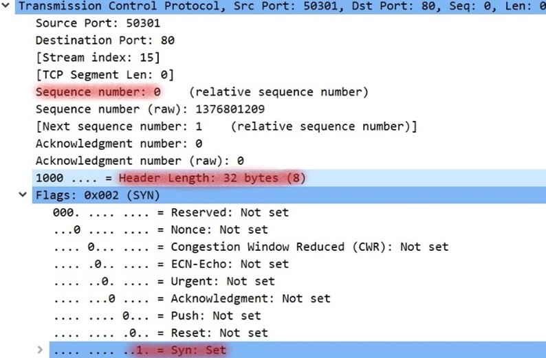 No 1526 패킷은 클라이언트 어플리케이션 프로세스가 서버의 프로세스와 TCP연결을 설정하기를 원한다고 클라이언트의 TCP에게 먼저 말하고 클라이언트의 트랜스포트 계층에서 서버의 TCP와 TCP연결을 설정(초기화)을 요청하는 과정이다. 연결을 초기화하는 프로세스를 클라이언트 프로세스, 이때 연결 요청을 받는 프로세스를 서버 프로세스라고 한다. [사진6]은 no 1526 패킷의 상세 정보이다. 이때 SYN플래그를 1로 설정하며 32bit로 구성된 임의의 sequence number를 설정하여 보낸다. wireshark에서 순서번호 0은 상대적인 순서번호를 보여주며 실제로는 32bit로 구성된 임의의 숫자이다. 또한 이 패킷에는 date를 포함하지 않으며 header length가 32byte인 것으로 보아 기본 20byte header에 option이 12byte 추가되었다. 이 시점은 클라이언트가 CLOSED상태에서 SYNSENT상태가 된다.