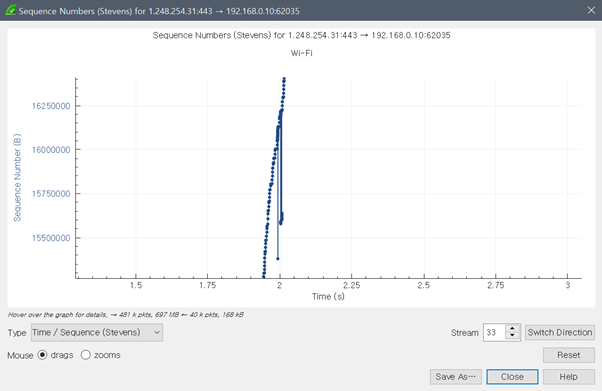 x축은 시간이고 y축은 실제 순서번호를 보여주는데, 시간이 2초 주변 부분에 순서번호가 급격히 떨어졌음을 알 수 있다. 이를 좀 더 확대하면 다음과 같다.