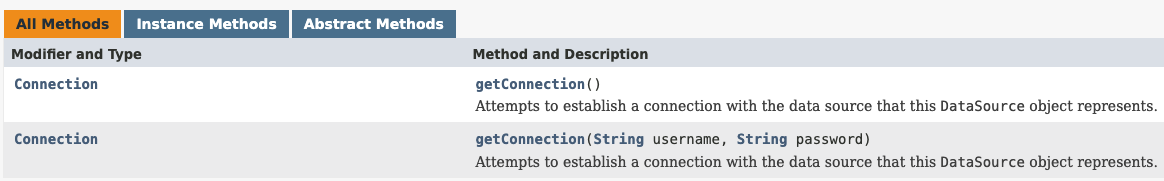 cf. DataSource의 메소드를 보면 JDBC URL을 지정하지 않고 커넥션을 가져온다는 점이 특징이다. 설정과 사용을 분리함으로써 설정과 관련된 속성들에 대한 변경에 유연하게 대응할 수 있다.