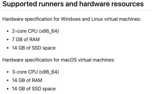 현재 필자는 클라우드 인스턴스나 CI서버를 새로 구할 수 없는 상황이며, 진행 중인 프로젝트는 Github에 public 레포지토리로 관리되기 때문에 Github Actions를 선택했다. Github Actions는 클라우드 기반으로 CI 서버를 제공하며 무료 버전의 경우 최대 20개까지 동시 작업을 추가할 수 있다.(단 macOS는 5개) 다음은 Github Actions 클라우드에서 제공하는 가상 머신의 스펙이다. (추후 변동 가능)