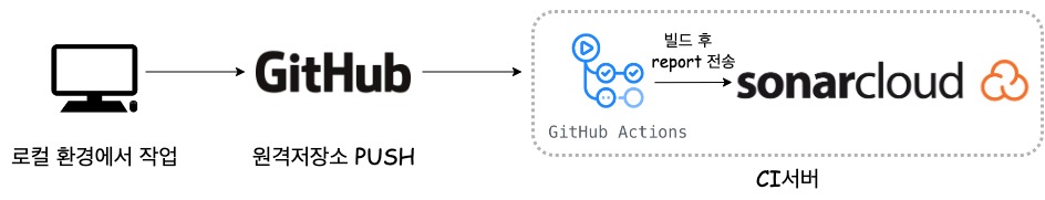 지금까지 구축한 CI-based analysis의 전체적인 흐름은 위와 같다. 개발자가 로컬 환경에서 작업한 뒤 원격 저장소로 Push 하면 해당 코드가 CI 서버인 Github Actions로 넘어가고 CI 서버에서는 애플리케이션을 빌드(테스팅 과정 포함) 한 후 테스트 커버리지 결과 리포트를 만든다. 만들어진 리포트는 SonarCloud로 전송되며 코드의 정적분석과 테스트 커버리지에 대한 지속적인 관리와 기록을 수행한다.