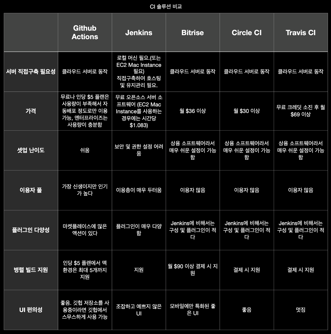 빌드를 하고 테스트 커버리지를 계산하여 SonarQube에 넘겨 이에 대한 기록을 남기기 위해서 CI서버가 필요하다. 아래는 다양한 CI 솔루션을 비교한 자료이다.
