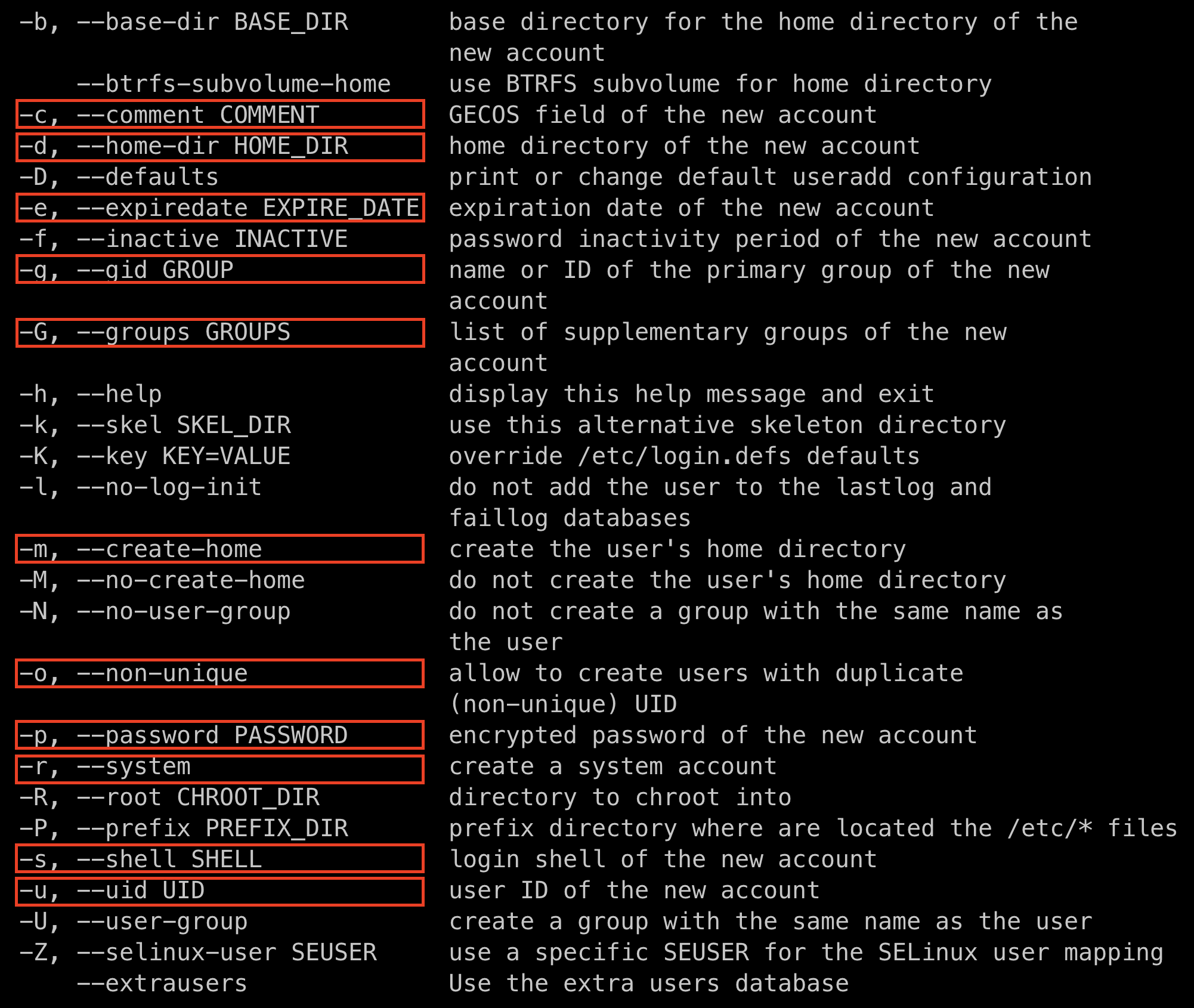 위 옵션에서 빨간 박스로 표시한 옵션은 자주 사용되는 옵션들이다. 여기에는 계정 생성 시 홈 디렉토리도 바꾸거나 유저 comment를 남기는 등 다양한 옵션이 있다. 기본적으로 옵션을 넣지 않아도 private group은 자동으로 생성되며 만약 additional group(supplementary group)을 만들고 싶다면 -G 옵션을 사용한다.