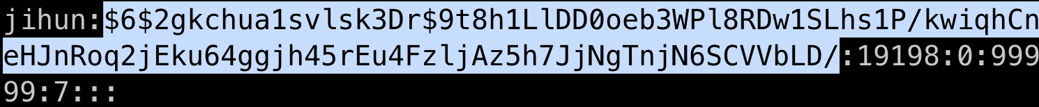 - encryped password와 비밀번호의 aging 정보가 저장된다.