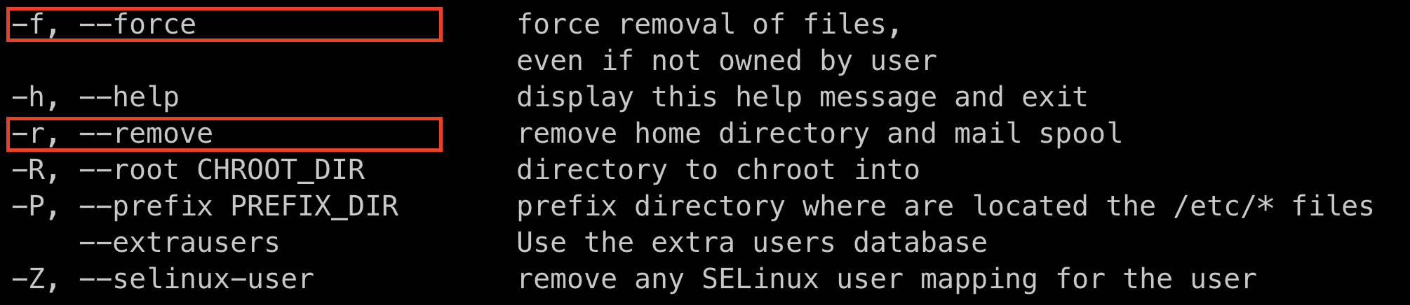 위 명령어는 계정을 삭제하나 home 디렉토리와 같은 정보들은 삭제되지 않는다. 따라서 -r 옵션을 사용해서 유저 디렉토리까지 모두 지워지도록 한다.