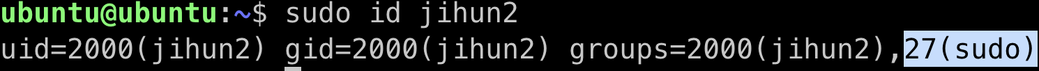 * 주의: 위 명령어에서 -a를 없애고 실행하면 jihun 계정이 소속된 기존 supplemenary 계정을 모두 지우고 sudo 계정만 추가한다.