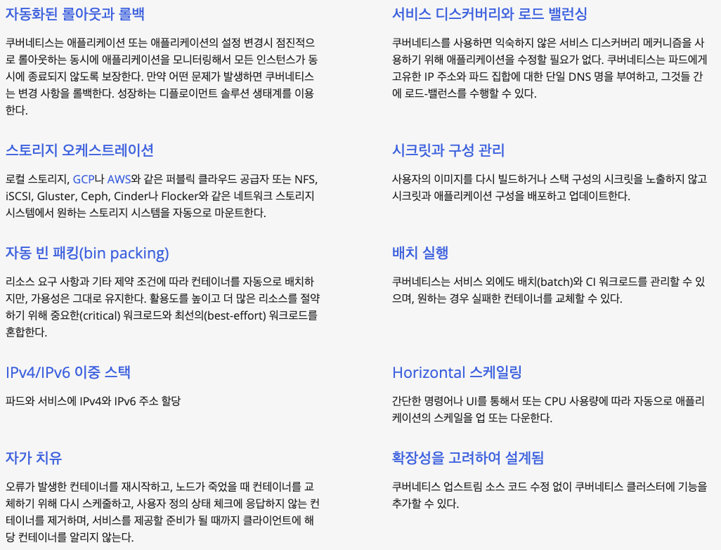쿠버네티스 공식 사이트에 들어가면 쿠버네티스가 제공해주는 10가지 기능에 대해 설명되어 있다. 이중에서도 자가 치유(Self-healing)에 대한 부분을 이번 포스팅에서 다루도록 한다.