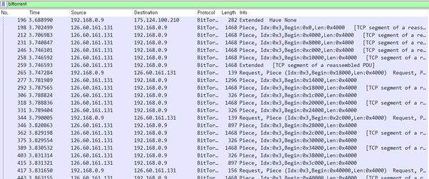 또한 필자는 P2P application에서 주고받는 메시지를 확인하고 싶었고, 토렌트에서 임의의 파일을 다운받는 동안 Wireshark에서 감지를 시작하였다. 이번에는 유선의 데스크톱을 이용하였고 IPv4주소는 192.168.0.9이다.