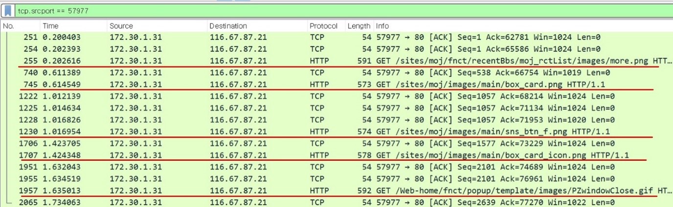 우선 현재 대표적으로 알려진 HTTP Pipelining을 적용한 브라우저는 ‘Opera’라고 한다. 따라서 필자는 Opera브라우저를 통해 법무부 홈페이지를 방문했다. [그림7]에서 밑줄 친 부분을 보면 요청 메시지가 ‘연속하여 발생’했음을 확인할 수 있다. 그리고 밑줄 친 요청 메시지들은 “모두 같은 Source Port번호를 통한 요청”이었다. 또한 HTTP버전이 1.1인 점과, ‘GET’ method를 사용했다는 점에서 HTTP Pipelining기법을 사용했음을 알 수 있다. 물론, 밑줄 친 모든 요청 메시지 모두 Connection필드 값으로 ‘keep-alive’를 명시함으로써 Persistent Connection을 기반으로 Pipelining기법을 사용하고 있음을 알 수 있다.