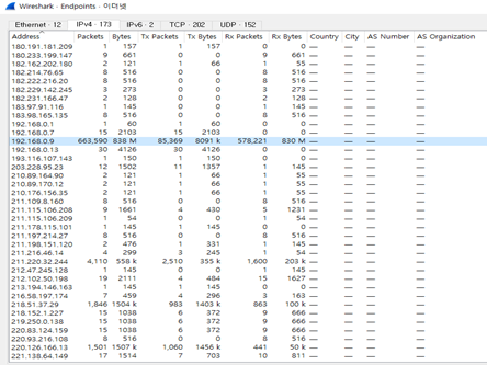 [그림14]는 Wireshark에서 상단부의 Statistics -> Endpoints의 결과이다. 이는 나와 연락한 다른 peer들의 IP주소를 보여주며, p2p application을 이용하는 개인과 개인이 직접 연결되어 파일을 공유한다는 사실을 확인했다.