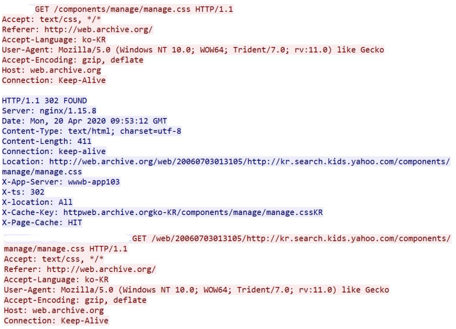 [그림8]은 http://web.archive.org/ 에 접속하였을 때의 HTTP요청과 응답을 보여준다. 처음요청에 대한 응답을 보면 Status line에 ‘302 FOUND’라는 문구가 보인다. 이는 해당 Content가 다른 곳으로 이동했음을 의미하며 Location 필드 값으로 Content가 있는 위치를 알려준다. 그 후, Client는 Server로부터 받은 Location에 http요청을 다시 보낸다.