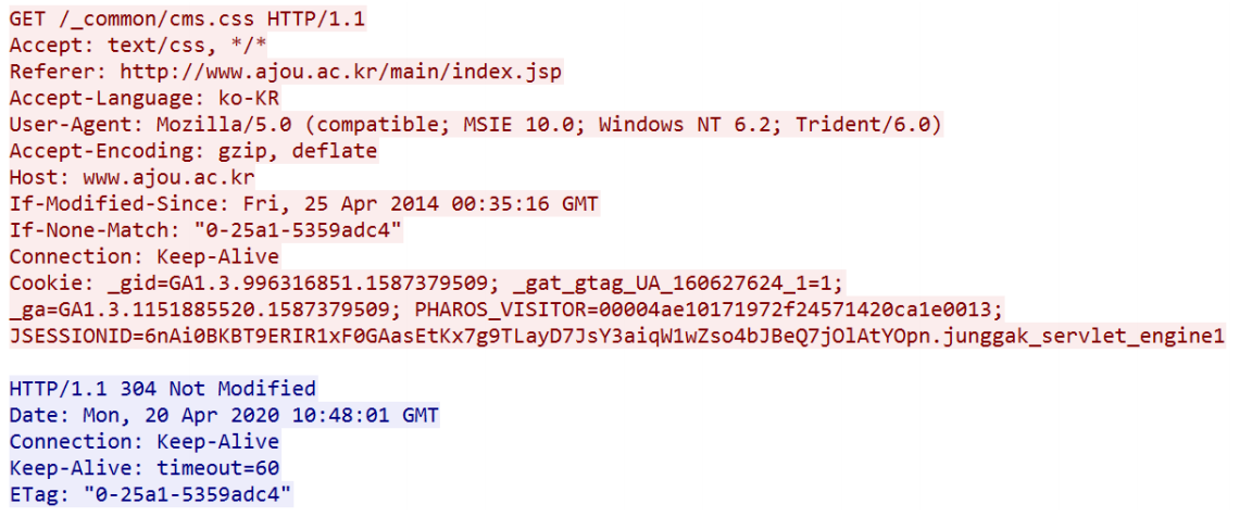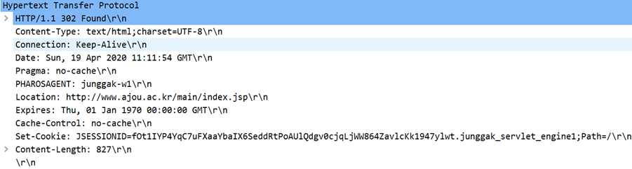 [그림4]는 아주대학교 홈페이지를 관리하는 서버로부터 처음으로 받은 HTTP Response Message이다. Status line의 ‘302 Found’에서 응답코드 302는 요청한 Content가 없는 것은 아니지만 이동하였음을 의미하는 분기처리(redirect)를 보여준다. Location필드 값으로 재요청을 하면 Content를 받을 수 있다. redirection에 대해서는 2-3)에서 언급하도록 한다. ‘Content-Type’은 Server가 보내는 Content의 형식을 보여준다. 즉, Server가 현재 보내는 Content에는 text문서와 html문서를 포함하며 Character set은 UTF-8로 인코딩되어 있다. ‘Connection’ field는 위의 Request Message와 공통으로 사용되며 여기서는 Request Message에서 보낸 Connection에 대한 응답이다. 따라서 Server는 ‘연결을 끊지 않을 테니 요청을 계속 보내도 된다’라는 응답을 한 것으로 해석된다. ‘Date’또한 Request, Response Message에서 공통으로 사용되며 HTTP Message가 만들어진 시각을 의미한다. ‘Pragma: no-cache’는 캐시데이터를 사용하기 전에 서버로 요청을 보내 유효성 검사를 강제한다. PHAROSAGENT는 중개서버를 명시한다. 아주대학교 홈페이지는 junggak-w1이라는 중개사를 이용중인 것으로 보인다. Location은 앞서 말한 ‘302 Found’에서 이동된 Content의 위치를 알려준다. Client는 서버가 알려준 Location으로 재요청 메시지를 보낼 수 있다.