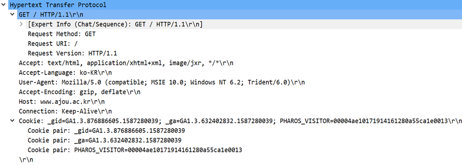 위 [그림1]은 Internet Explorer로 아주대학교 홈페이지를 http로 접속하고 아무것도 하지 않은 상태에서 주고받은 HTTP 메시지의 결과이다. Client PC는 필자의 노트북이며 분당선 오리역 근처의 한 카페에서 WIFI를 연결했다.