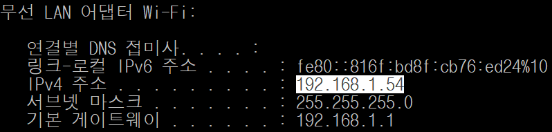 [그림1]의 No. 2131와 No. 2259의 패킷 정보를 보면 Source가 192.168.1.54라고 보여진다. 이는 [그림2]와 같이, Windows의 cmd창에서 ‘ipconfig’ 명령어를 입력하여 얻어낸 결과인 현재 Client PC가 WIFI로 접속한 IP주소와 일치했다. 따라서 Source의 주소는 WIFI를 사용중인 브라우저의 IP주소이며 HTTP요청 메시지를 보내는 주소이기도 하다. Destination에 보여지는 202.30.0.19는 HTTP요청 메시지가 도착한 주소이다. No. 2131와 No. 2255는 Source와 Destination 주소가 서로 반대로 보여진다. Wireshark에서 부여된 패킷 번호는 기본적으로 순서대로 정렬된다. 따라서 Client가 No. 2131 패킷을 요청 메시지로 보내고, No. 2255는 서버가 응답한 패킷으로 생각할 수 있다. Destination의 오른쪽 2번째 항목인 Length는 HTTP메시지의 길이를 나타낸다. No. 2131의 Request Message보다 No. 2255의 Response Message의 Length가 더 큰 것은 Response Message는 Header뿐만 아니라 Body(실질적인 Content)부분을 포함하기 때문이다.