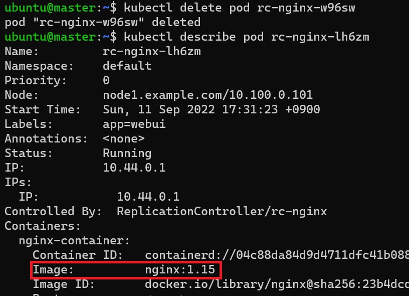 아래와 같이 'rc-nginx-w96sw' Pod를 delete 하고 RC에 의해 새로 생성된 Pod(lh6zm)의 이미지 버전을 확인해본 결과 아래와 같이 새로운 컨테이너가 실행되었음을 확인할 수 있다.