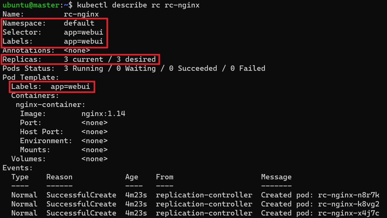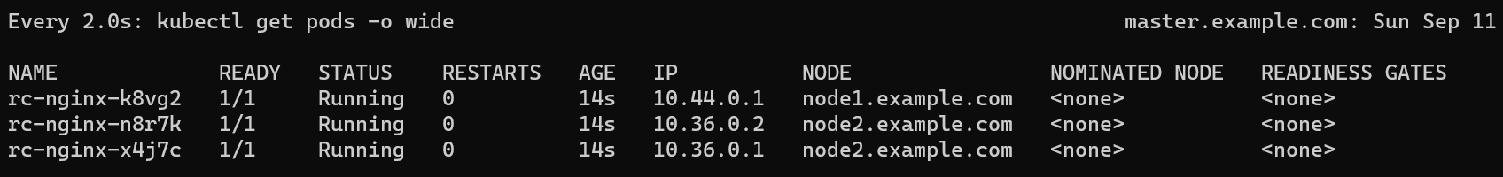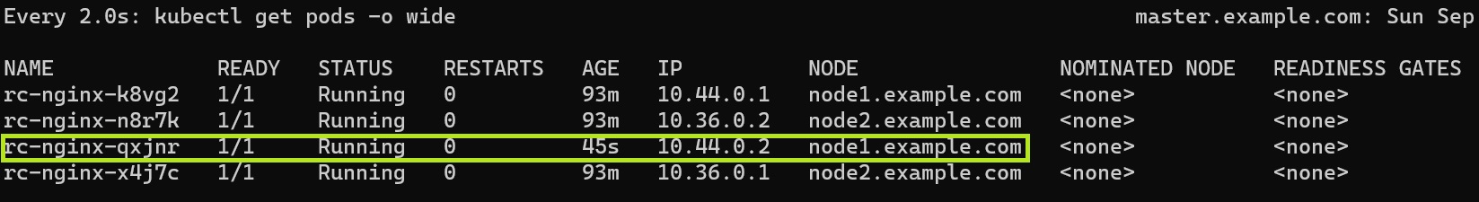 - 동작중인 rc-nginx pod가 없으므로 replicas 개수에 맞게 총 3개가 새롭게 시작되었음을 확인할 수 있다.