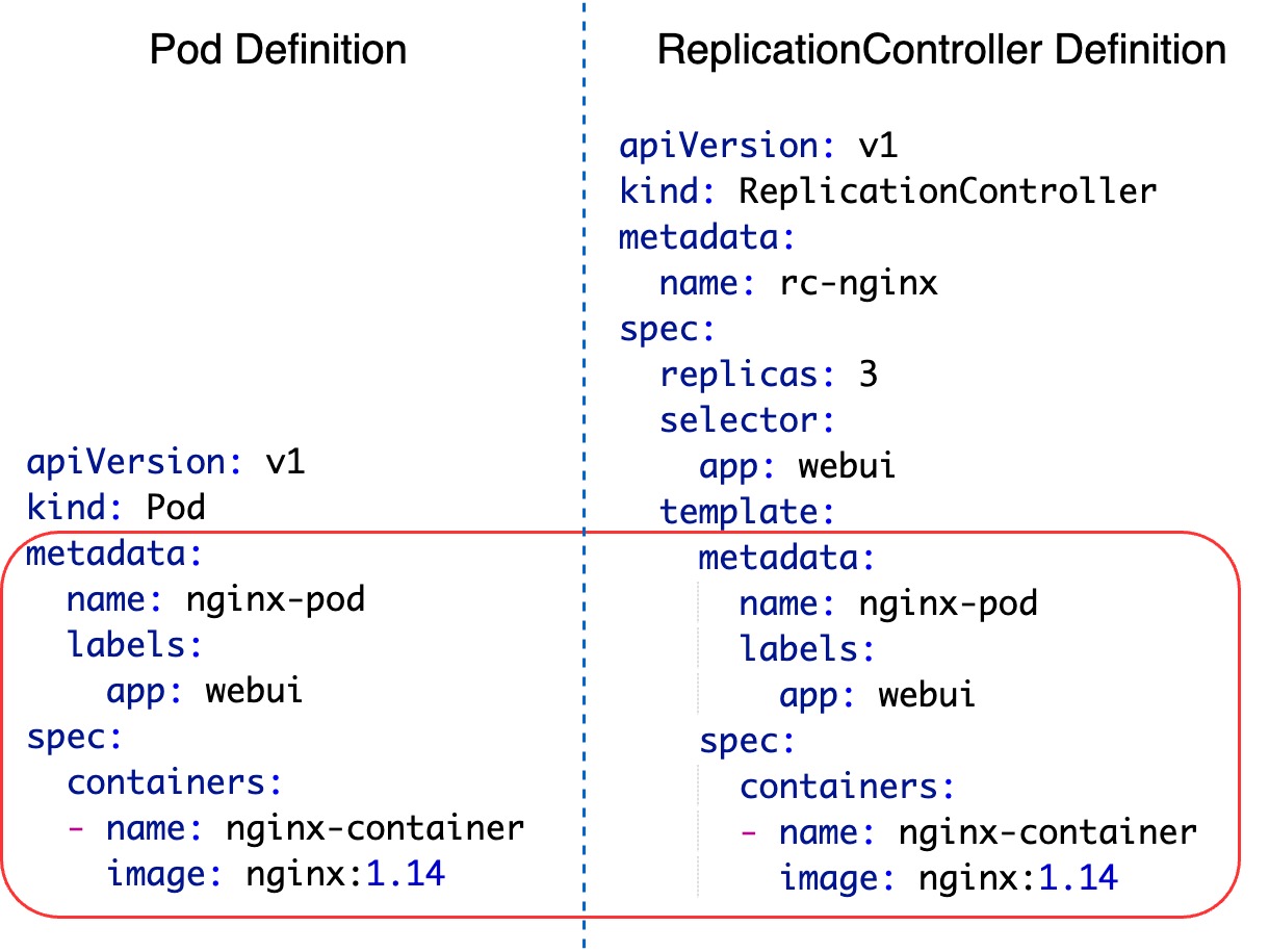 기존 Pod 정의에서도 각 Pod 마다 label을 정의할 수 있었다. label은 key:value 형태로 정의된다. 오른쪽 ReplicationController의 정의에서 selector 필드는 app: webui라는 label을 가진 Pod를 3개 보장해달라는 의미이다. 이때 새로 생성할 Pod의 정의는 template에서 한다.