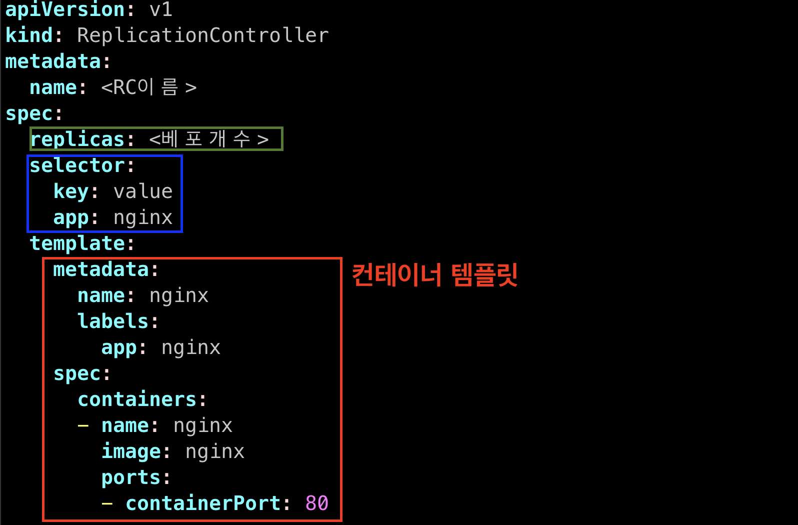 Pod template은 반드시 selector에 있는 <key>: <value>를 labels 필드로 포함하고 있어야 한다. 단, template의 labels에 정의된 label 개수는 selector에 정의된 label보다 많아도 상관없다. 단, template에 정의된 label 중 하나는 selector에 포함되어야 한다. rc의 selector는 label들의 AND 조건을 기반으로 연산하기 때문에 2개 이상의 label을 selector에 정의한다면 template의 label에도 이를 모두 포함해야 rc의 스캔 대상이 된다.
