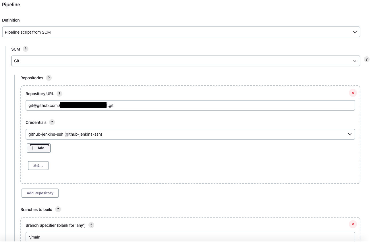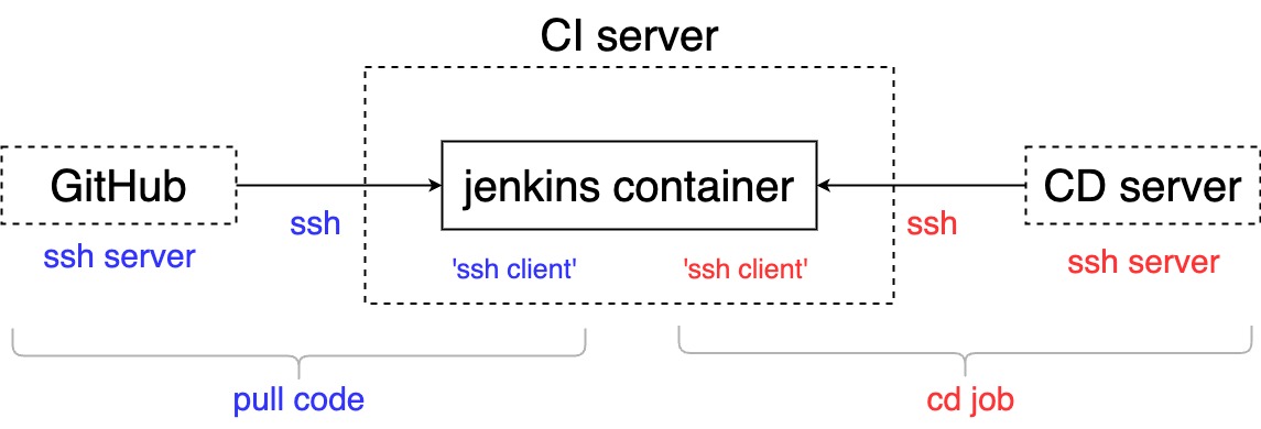 즉, jenkins가 SCM으로부터 코드를 가져오는 작업에서도 SSH client 입장이고(WebHook 미사용일 경우) CD서버에 접속하는 부분에서도 SSH client 입장인 것이다. 따라서 두 작업에 필요한 SSH private key는 모두 jenkins 쪽에 있어야 한다.